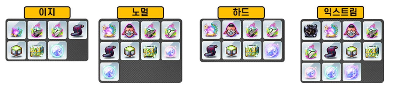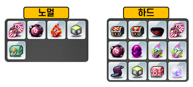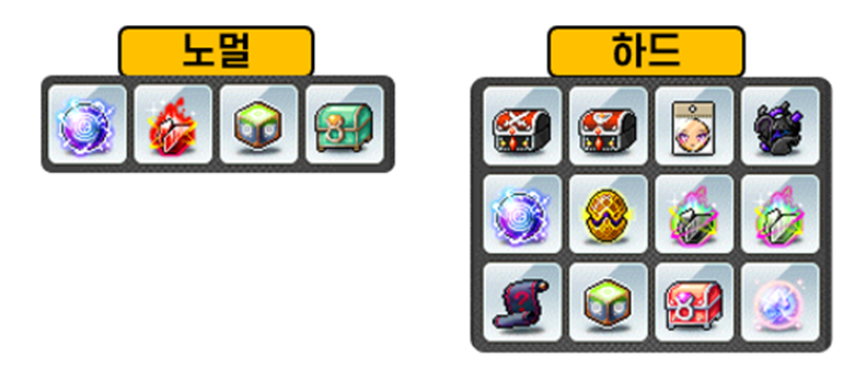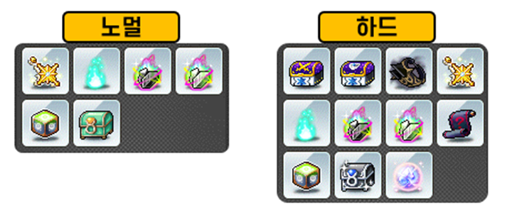 | 스우 | ![]() 앱솔랩스 무기 상자, 앱솔랩스 방어구 상자, 루즈 컨트롤 머신 마크, 손상된 블랙 하트, 특수형 에너지 코어(S급), 스우로이드, 검은 환생의 불꽃, 영원한 환생의 불꽃, 놀라운 긍정의 혼돈 주문서 60%, 수상한 에디셔널 큐브, 녹옥의 보스 반지 상자 (하급), 홍옥의 보스 반지 상자 (중급), 솔 에르다의 기운 |