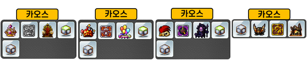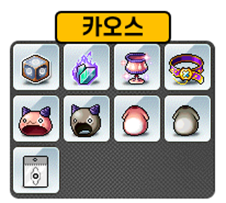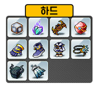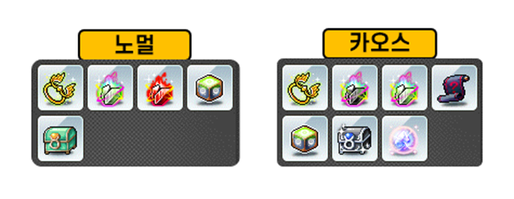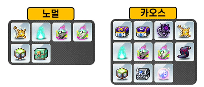 | 칼로스 | ![]() 남겨진 칼로스의 의지, 검은 환생의 불꽃, 영원한 환생의 불꽃, 놀라운 긍정의 혼돈 주문서 60%, 수상한 에디셔널 큐브, 백옥의 보스 반지 상자 (최상급), 솔 에르다의 기운, 니키로이드, 파멸의 징표, 남겨진 칼로스의 의지 조각 |