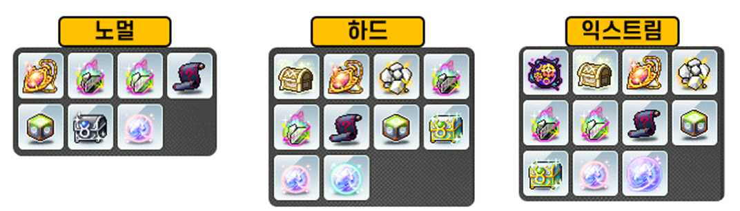 | 데미안 | ![]() 앱솔랩스 무기 상자, 앱솔랩스 방어구 상자, 마력이 깃든 안대, 루인 포스실드, 뒤틀린 낙인의 영혼석, 데미안로이드, 검은 환생의 불꽃, 영원한 환생의 불꽃, 놀라운 긍정의 혼돈 주문서 60%, 수상한 에디셔널 큐브, 녹옥의 보스 상자 (하급), 홍옥의 보스 반지 상자 (중급), 솔 에르다의 기운 |