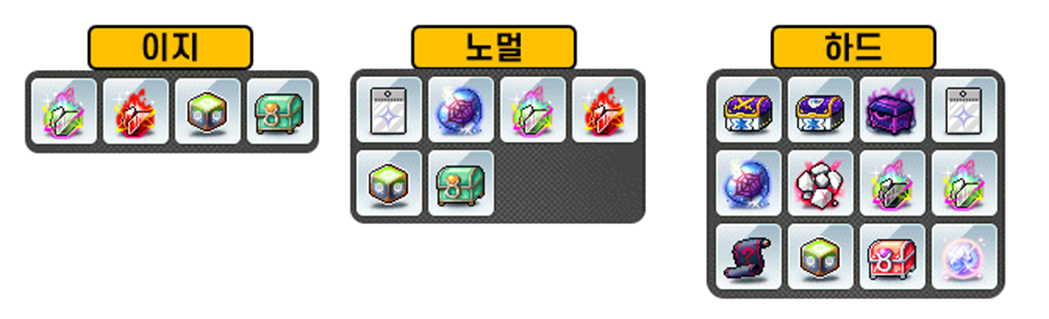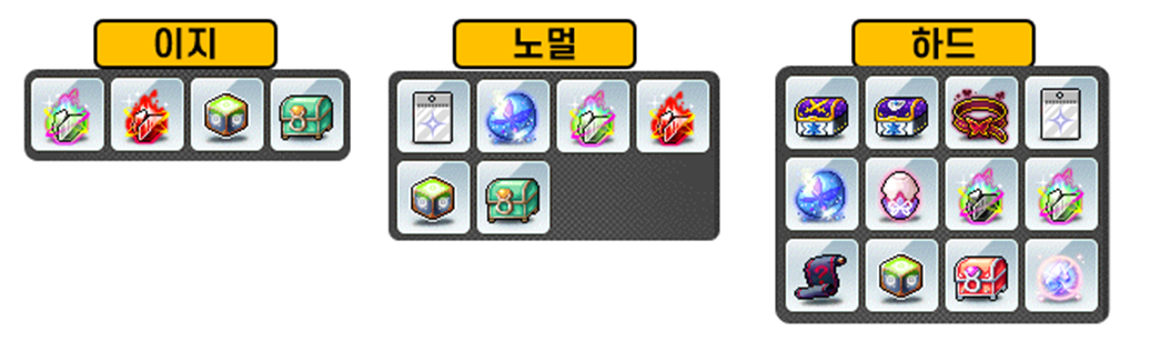 | 더스크 | ![]() 아케인셰이드 무기 상자, 아케인셰이드 방어구 상자, 거대한 공포, 에스텔라 이어링, 염원의 불꽃, 검은 환생의 불꽃, 영원한 환생의 불꽃, 놀라운 긍정의 혼돈 주문서 60%, 수상한 에디셔널 큐브, 녹옥의 보스 반지 상자 (하급), 흑옥의 보스 반지 상자 (상급), 솔 에르다의 기운 |