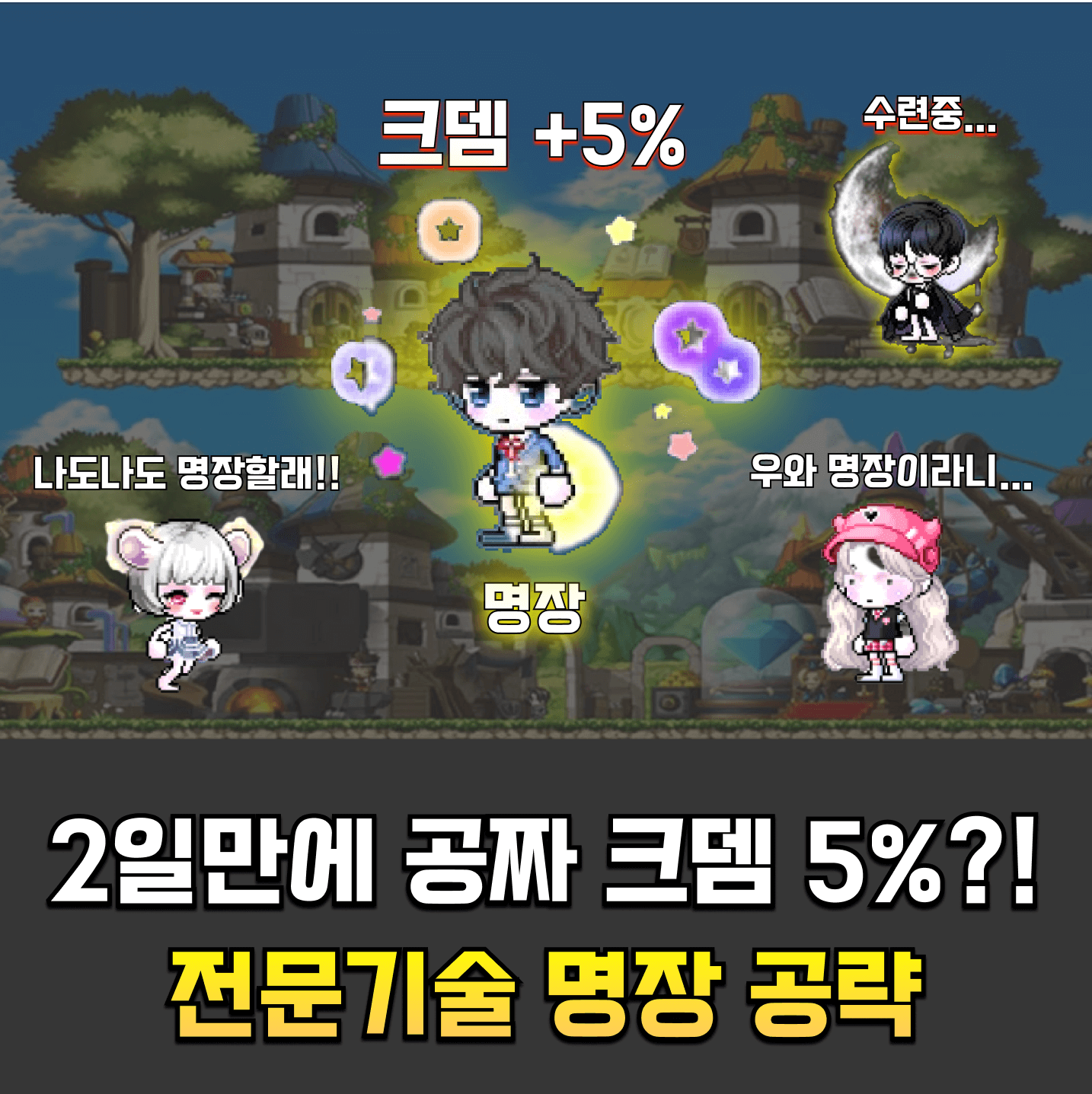 메이플스토리 마이스터빌 전문기술이 개편됩니다. 이젠 모든 전문기술을 배울 수 있을 뿐더러, 크뎀5%라는 스펙업을 2~3일 만에 할 수 있게 되었기 때문에, 최대한 빨리 달성하시고 스펙업 하시기 바랍니다.